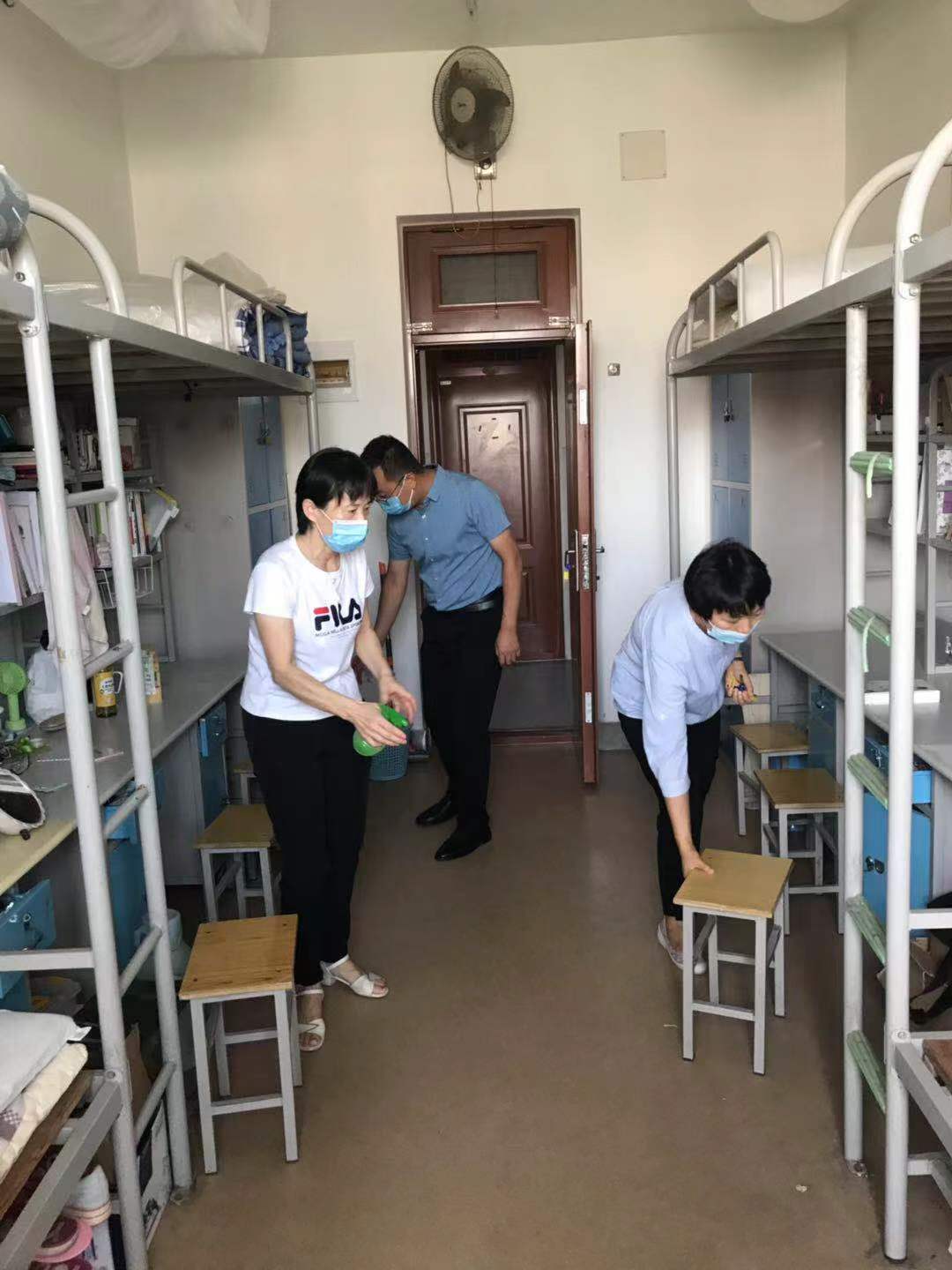 学院全体辅导员班主任对学生宿舍消杀通风 发布时间: 2021-08-28 根据秋季开学工作方案安排,8月26日上午,学院党总支副书记康延军带领全体辅导员、班主任对紫藤4、紫藤5和紫藤6公寓集中消杀通风。老师们做好个人防护,带好消杀工具对每间宿舍逐一检查,每到一处都认真仔细,不留死角,圆满完成清理垃圾、喷洒消毒液、开窗通风、检查安全隐患等工作。 开学前对宿舍消杀通风是学院常态化疫情防控的一项重要措施,是学生返校前的一项重要准备工作,充分体现对学生的关心关爱,为学生营造整洁健康的住宿环境。