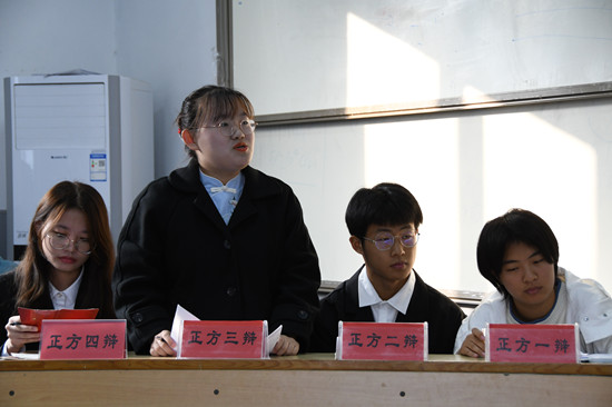 本次决赛共设有三场比赛,采用车轮形式,即三支队伍两两对决。第一轮中的两支队伍就“故事的结局重不重要”辩题展开了激烈的舌尖交锋,正方三辩臧雯淼出口成章,铿锵有力地对反方论点进行了质询,将辩论赛紧张的气氛推到了高潮。正方四辩戚馨玉逻辑清晰,针对对方辩手的思维漏洞展开了分析总结,先下一城,赢得第一轮胜利。第二轮两个队伍也是不相上下。比赛来到最后一轮,由二班与七班进行最终的角逐,辩论开始双方竞争激烈,互不相让,正方一辩以概念先行,立足本场观点。反方三辩张玉洁针对对方辩手的漏洞逐一反击,不断给反方抛出问题,妙语连珠。本场辩论赛不仅是智慧的较量,更是精力的考验,反方辩手在长时间的辩论中精力略微下降,正方据理力争,乘胜追击,取得了本次决赛的冠军。高质量的辩论赛离不开评委们的精炼点评,在场评委对各位选手进行了客观的评价与认可,对各位选手在之后的辩论赛中的表现有很大的帮助。