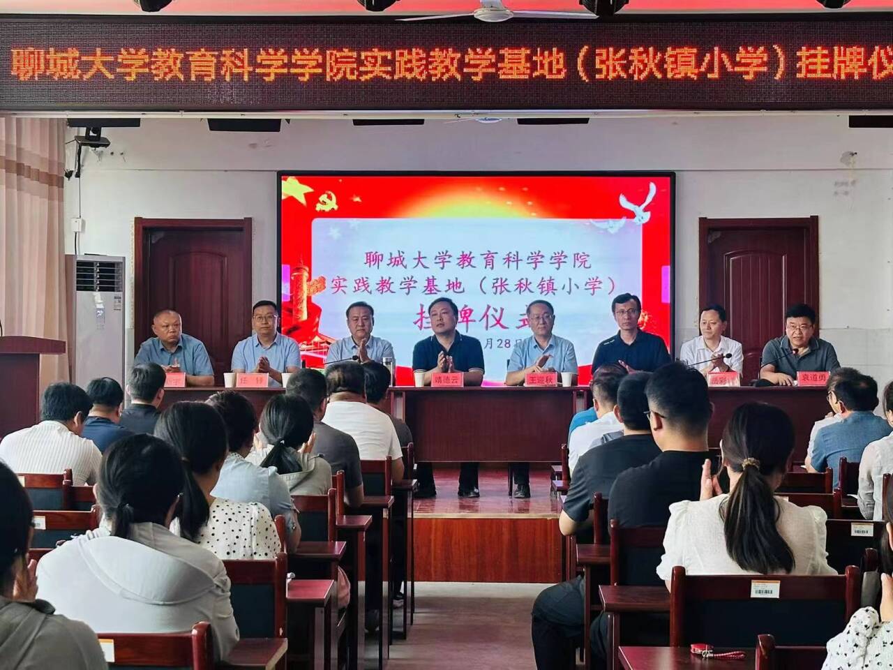 6月28日,绿帽奴 在聊城市阳谷县张秋镇小学举行实践教学基地挂牌仪式,学院党委书记王迎秋,院长李军,副院长满忠坤,办公室主任任锋,阳谷县委常委、宣传部部长、县委教育工委书记靖德云,阳谷县张秋镇党委书记孙新宇,阳谷县教育和体育局党组书记、局长岳彩祥,阳谷县张秋镇小学校长闫庆东等共同参加挂牌仪式。阳谷县教育和体育局副局长袁道勇主持仪式,岳彩祥致欢迎词。