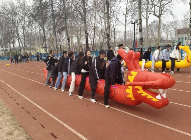 “旱地龙舟”环节则是速度与激情的比拼。同学们跨上色彩鲜艳的充气龙舟,口号响亮,步伐一致,在跑道上奋勇向前。他们宛如一条条灵动的蛟龙,体现着团队的凝聚力和拼搏精神,现场加油声此起彼伏。
